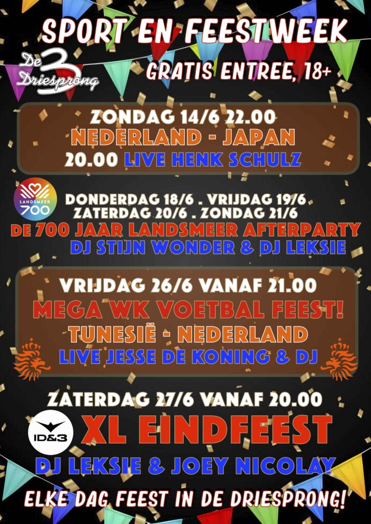 - Vanaf 11.30 groot feest voor de deur bij de 3 Sprong en op het terras. Met LIVE MUZIEK, DJ en extra grote buitenbar! We beginnen EXTRA vroeg dit jaar!
